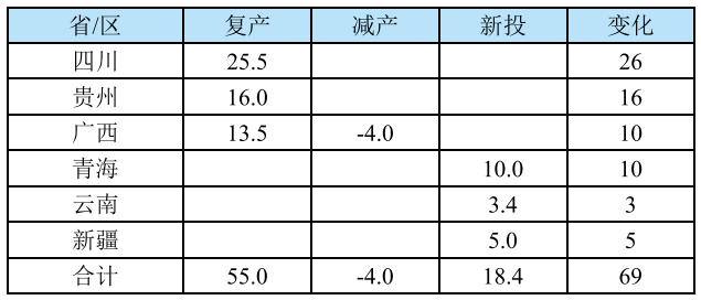 2025年復(fù)產(chǎn)產(chǎn)能55萬(wàn)噸/年,主要分布在四川、貴州和廣西等省/區(qū),復(fù)產(chǎn)產(chǎn)能大部分來(lái)自2024年底由于經(jīng)營(yíng)壓力過大而關(guān)停的企業(yè),還有一部分來(lái)自于技改后投放的項(xiàng)目。