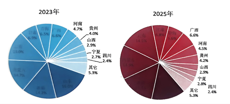 圖1-3 2023年和2025年中國(guó)電解鋁產(chǎn)能分布