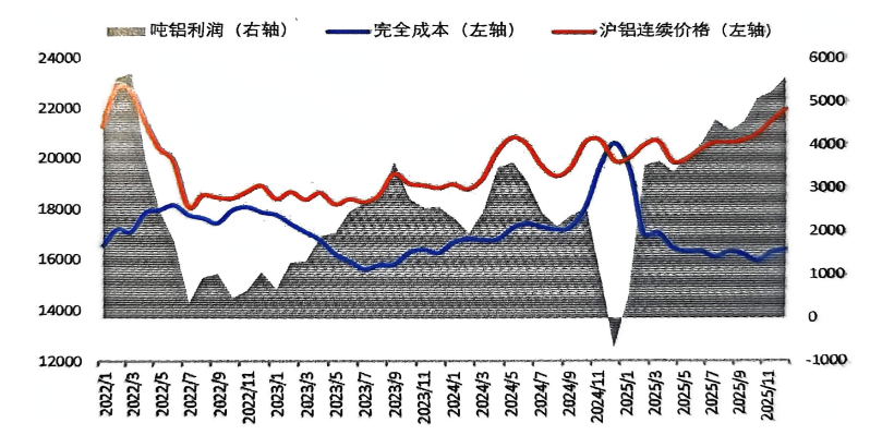 2025年,氧化鋁、電力等原材料及能源價(jià)格下跌帶動(dòng)電解鋁成本下降,同時(shí)受海外供應(yīng)擾動(dòng)、需求預(yù)期增長(zhǎng)以及美聯(lián)儲(chǔ)降息等多重因素影響,電解鋁價(jià)格繼續(xù)上行,全行業(yè)保持較高盈利水平。尤其四季度,隨著價(jià)格重心顯著抬升,噸鋁利潤(rùn)飆升至5000元以上。